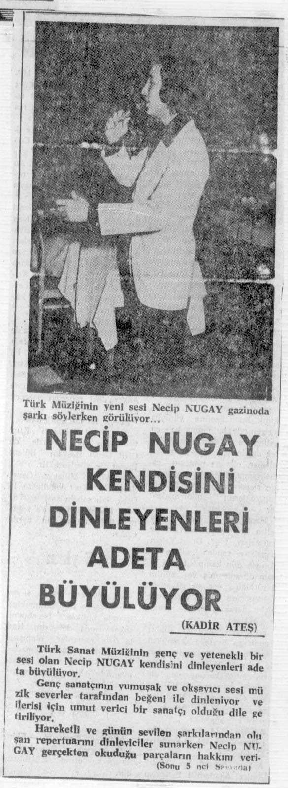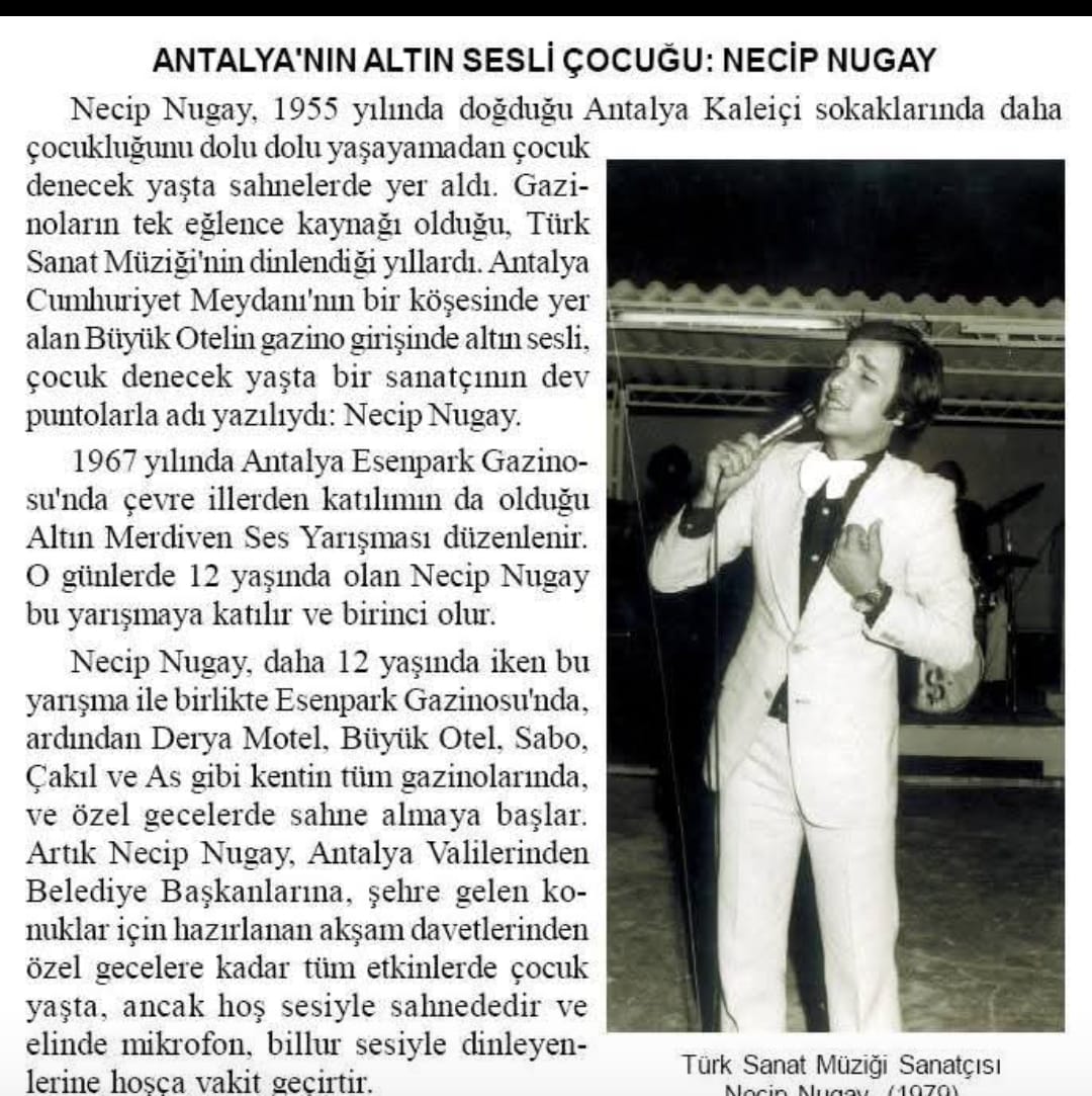 07.02.1955 tarihinde Antalya'da Dünya'ya gelen Necip Nugay henüz 13 yaşında Altın Merdiven Ses yarışmasını kazanarak sahnelere adım atmıştır. TRT Ankara Radyosunun düzenlediği Silifke Festivali Ses yarışmasında birinciliği kazandıktan sonra bir dönem Ankara Radyosunda görev almış, Muzaffer Özpınar bestelerinden oluşan "Gel de içme şu Dünya'nın kahrına, Aşk Treni, Kahpe Dünya gibi eserlerle iki adet 45 lik çıkarmıştır. Işıltılı sahne hayatını yarıda kesip Antalya'ya dönen Nugay bir çok konser ve yardım gecesinde sahne almış, Antalya halkı tarafından Antalya'nın altın sesli çocuğu olarak nam salmıştır. 12 Aralık 2015 tarihinde geçirdiği kalp kriziyle aniden aramızdan ayrılan Nugay'ın değerli hatırası ismini taşıdığı caddelerde, kent müzesinde adına yapılan köşelerde ve Antalya halkının kalbinde yaşamaktadır. VİDEO